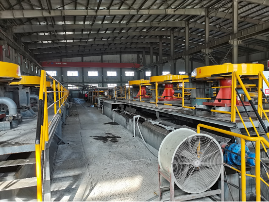 浮選工藝采用的是鉛鋅優(yōu)先浮選,鉛粗精礦再磨工藝。鉛系統(tǒng)和鋅系統(tǒng)浮選流程均為一粗三掃四精,并鉛粗精礦再磨至-325目92%。浮選機(jī)均采用先進(jìn)的充氣攪拌式浮選機(jī),浮選機(jī)轉(zhuǎn)速低,磨損小,電機(jī)能耗少,環(huán)保節(jié)能。浮選自動化程度高,配備浮選中央控制室。浮選機(jī)均安裝自動化液面控制系統(tǒng),根據(jù)泡沫層厚度,設(shè)定的液面高度,能自動調(diào)節(jié)閘門開關(guān)大小,有利于浮選液面的穩(wěn)定。浮選加藥系統(tǒng)采用北礦院生產(chǎn)的自動加藥機(jī),加藥閥門均采用氣動控制,加藥穩(wěn)定,加藥量精準(zhǔn)。浮選系統(tǒng)中有在線品位檢測系統(tǒng),能實(shí)時(shí)監(jiān)控原礦品位、鉛鋅精礦品位、尾礦品位等,對生產(chǎn)的穩(wěn)定有著良好的現(xiàn)場使用效果。